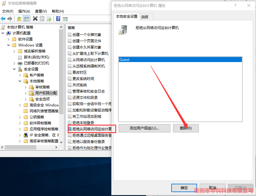 (1)、計算機配置->Windows設置->安全設置->本地策略->用戶權限分配->拒絕從網絡訪問這臺計算機->刪除Guest