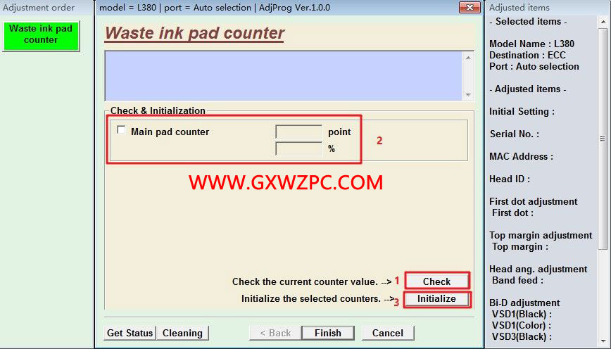 點擊Check按鈕,獲取當(dāng)前廢墨計數(shù)器的數(shù)值,然后選中計數(shù)器前面的選擇框,點擊Initialization按鈕完成初始化。
