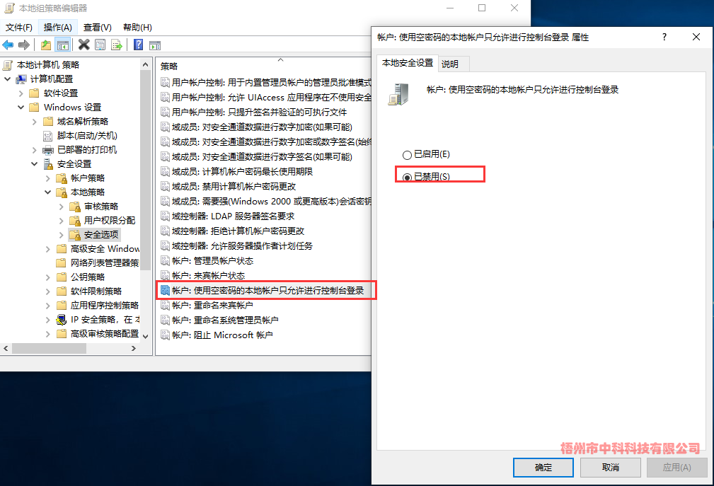 (2)、計算機配置->Windows設置->安全設置->本地策略->安全選項->帳戶:使用空密碼的本地帳戶只允許進行控制臺登錄->已禁用