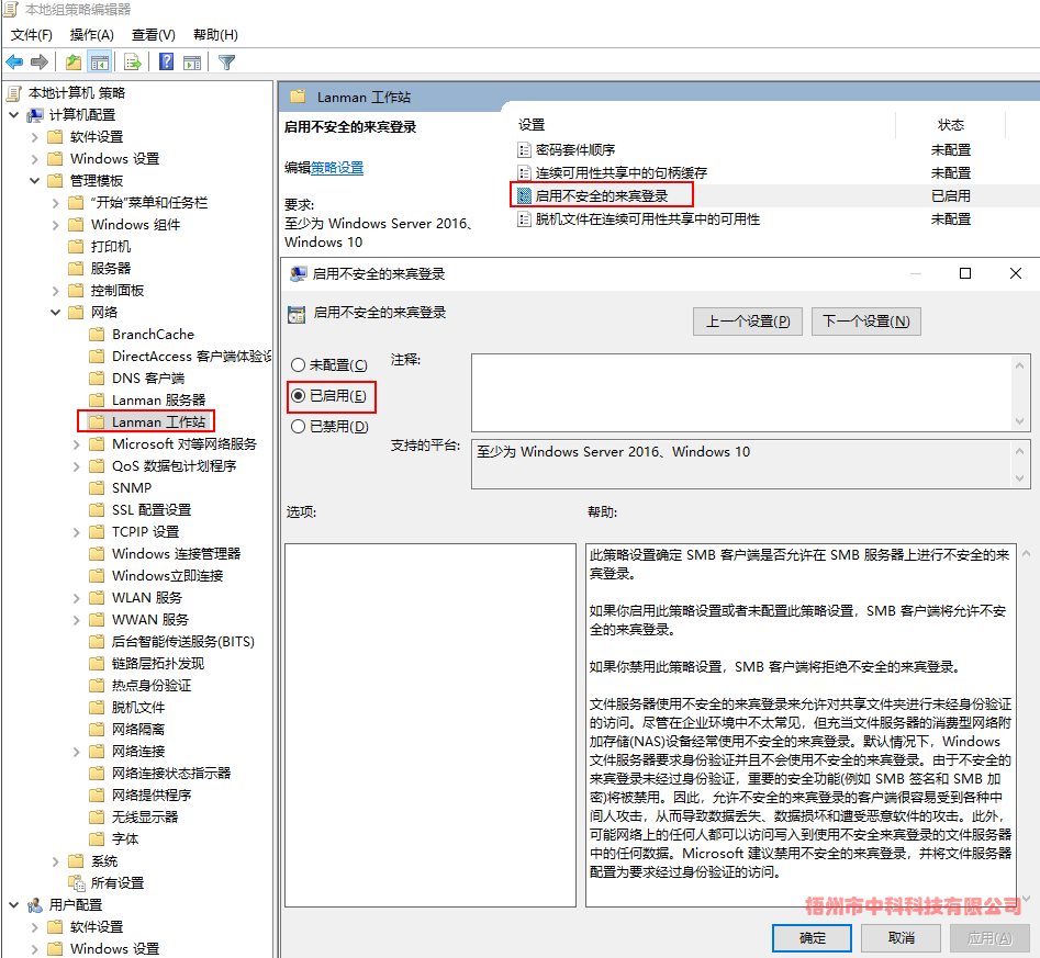 (3)計算機配置->管理模板->網絡->Lanman工作站->啟用不安全的來賓登陸->已啟用